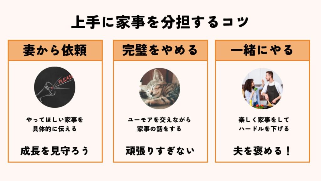 ここでは、話し合いが進まない夫でも、料理・洗濯・掃除をしてもらうコツを紹介します。