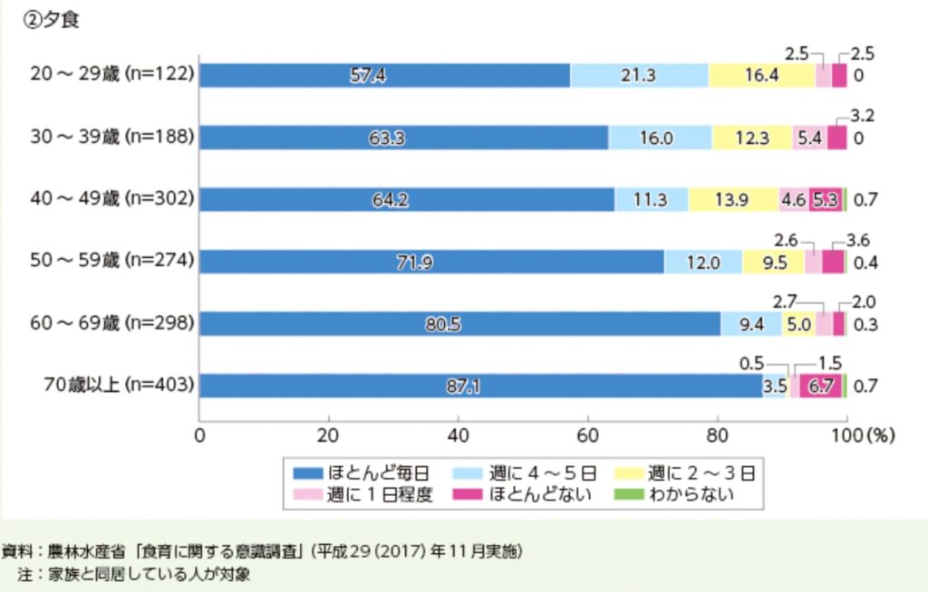 農林水産省が行った「食育に関する意識調査」によると、家族でご飯を食べる日数が週に5日以下の人(30代〜50代)は約3割いる結果でした。