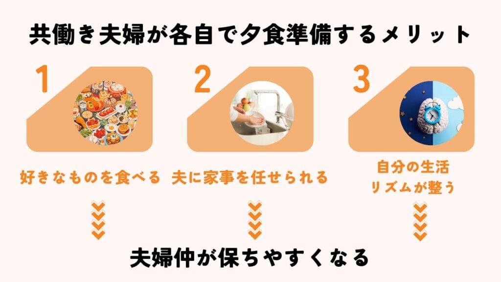 メニューが夫婦で異なる場合は食費がかかるデメリットがありますが、各自で夕食を準備すると、自由時間を確保しつつ自分のペースで過ごすことにつながります。